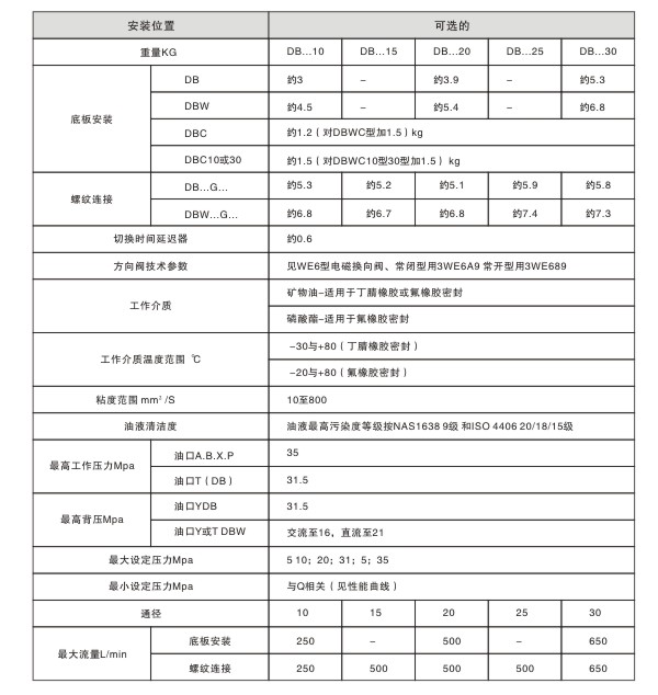 用于底板安裝,安裝面按DIN24340 E型,ISO 6264和CETOP-RP 121 H,用于螺紋連接,用于油路塊安裝。4種調(diào)整元件:①旋鈕②帶護(hù)罩的調(diào)節(jié)螺栓③帶刻度的有鎖旋鈕④帶刻度旋鈕。5種設(shè)定壓力,借助于安裝在其上的電磁方向閥操作卸荷??蛇x的切換時(shí)間延遲(僅DBW型)。