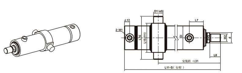 活塞桿端為外螺紋桿頭耳環(huán)連接