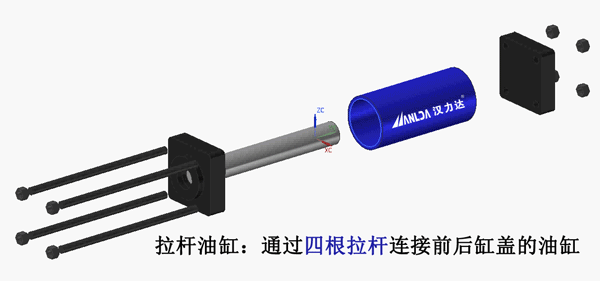 油缸的缸筒和上下蓋,用四根螺絲桿連接固定。